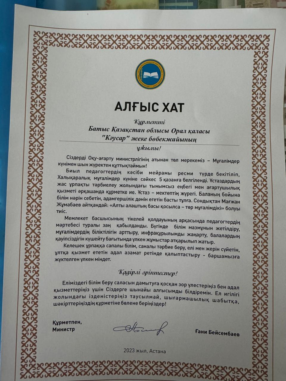 «Кәусар» жеке бөбекжайына 2-5жас аралығындағы балалар қабылданатынын назарларыңызға саламыз !!!